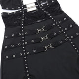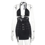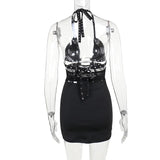 This dress is a super badass dress. It has so much different features such as the mesh, the polyester, halter, silver details. Has stretch but fits true to size.